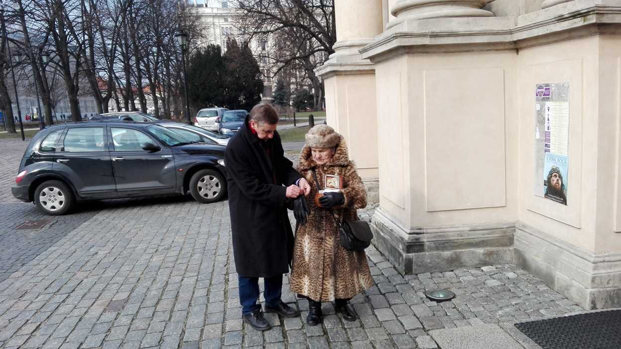 Kwesta na hospicjum w Wilnie ← Poprzednie Następne → pani Wanda Traczyk-Stawska szykuje się do zbiórki przy pomocy adiutanta – Wiesława Sikorskiego MPawlik