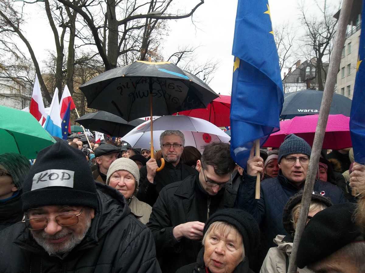 Manifestacja „Obywatele dla demokracji” ← Poprzednie Następne → pod parasolem zastępca prezydenta m.st. Warszawy Jacek Wojciechowicz, z flagą UE były wiceprezydent Warszawy Tomasz Sieradz MPawlik